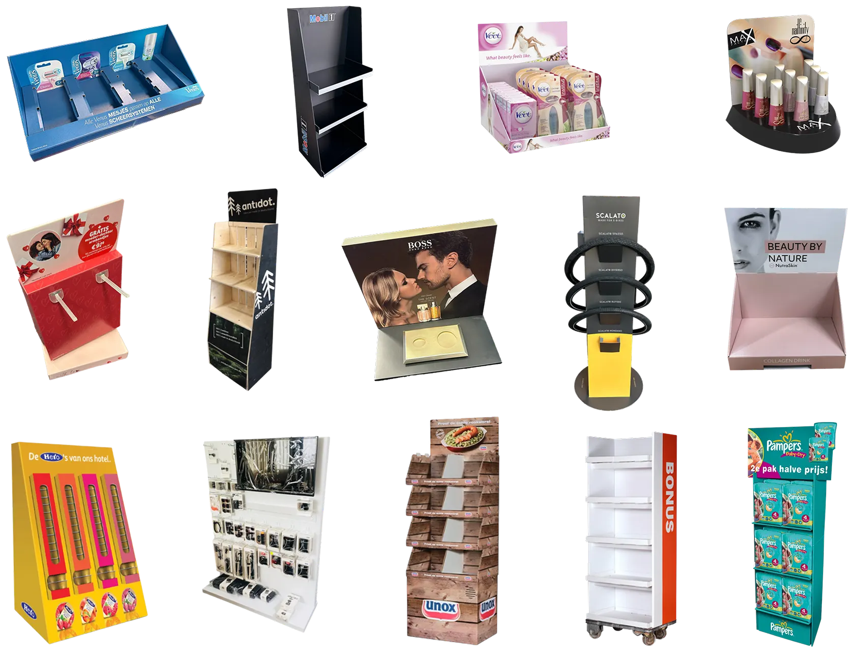 We ontwerpen en produceren uiteenlopende oplossingen: toonbankdisplays die producten direct in het oog laten springen, vloerdisplays die de winkelvloer tot leven brengen, schapdisplays die perfect aansluiten op bestaande winkelstellingen en kopstellingdisplays die extra aandacht trekken bij promoties. Daarnaast realiseren we Rolly, Dolly, Pallet en CHEP-display oplossingen, welke direct in de Retail kunnen worden geplaatst. Ook honingraatdisplays, licht van gewicht maar erg stevig om producten op te presenteren of permanente displays die merken langdurig zichtbaar maken.