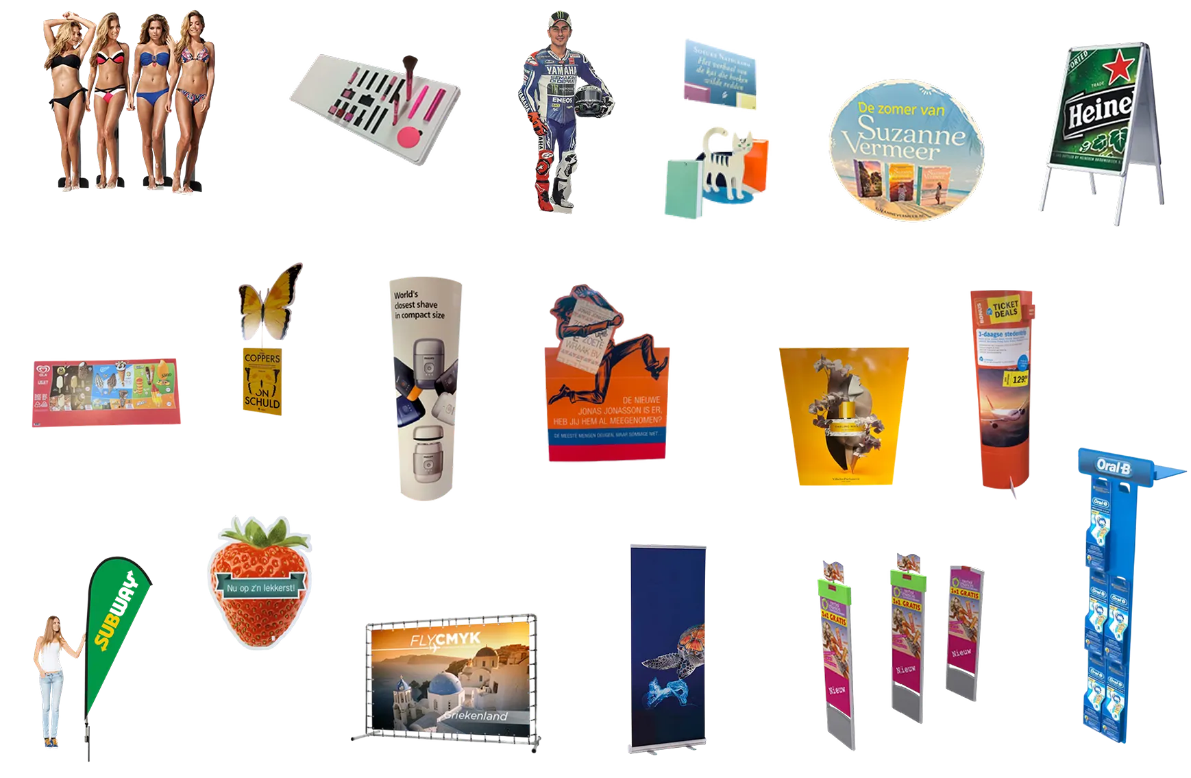 Wij produceren maatwerk POS-materiaal in elke gewenste oplage, van één exemplaar tot grootschalige campagnes. Ook in formaat zijn de mogelijkheden eindeloos – van klein en subtiel tot indrukwekkend XXL. Ons aanbod varieert van vloer- en raamstickers, posters en spandoeken tot blow-ups, mobiles, lifesizes en totems die uw merk letterlijk laten opvallen. Daarnaast produceren wij hangkaarten en detectiepoorthoezen welke strategisch gebruikmaken van de winkelruimte, voor extra branding.